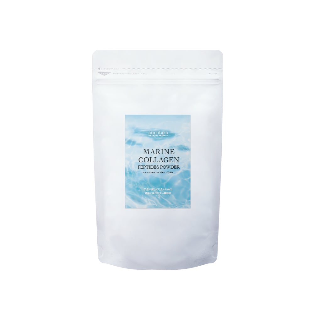 天然のタラ(鱈)皮から抽出したペプチドタイプのコラーゲンパウダー。水やお湯などの飲料に非常に溶けやすく、風味にくせのない顆粒状のため、手軽に摂取いただけます。私たちの体を構成するたんぱく質のうち、約1/3はコラーゲンであり、皮膚はもちろん、骨や血管、あらゆる臓器を構成する重要なたんぱく質です。コラーゲンは年齢と共に体内でつくられる量が少なくなるといわれ、毎日の食生活にマリンコラーゲンペプチド パウダーを大さじ1杯※プラスすることで、普段の食事からは摂りづらいコラーゲンを手軽に補うことができます。